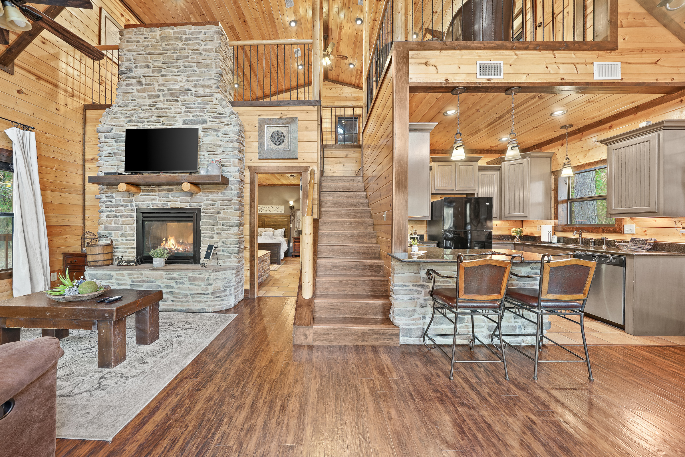 As you enter the cabin, you will be drawn to the double-sided fireplace. Set the tone for relaxation with the flames provided with a simple flip of a switch. Enter the sanctuary of the master bedroom with ensuite bathroom. The master suite provides a king bed and and a huge, luxurious bathtub for two next to the fireplace. The ensuite bathroom feature is the large shower for two.